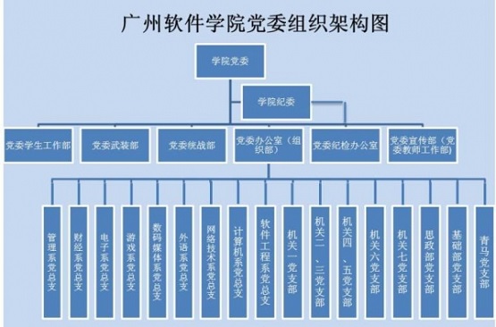广州大学华软软件学院于2002年成立党支部,2004年成立党总支,2007年成立党委。学院党委现有党委委员8人,设书记1人,副书记1人。党委下设有党委办公室、党委组织部、党委宣传部、党委统战部、党委教师工作部、党委学生工作部、党委武装部、纪检监察办公室等工作机构,有专职党务干部20人,兼职党务干部59人,配备组织员12名。学院党委下辖10个党总支,8个直属党支部,有教工党支部17个,学生党支部13个,党员人数743人,其中教职工党员321人,学生党员422人。(统计截止2021年3月)