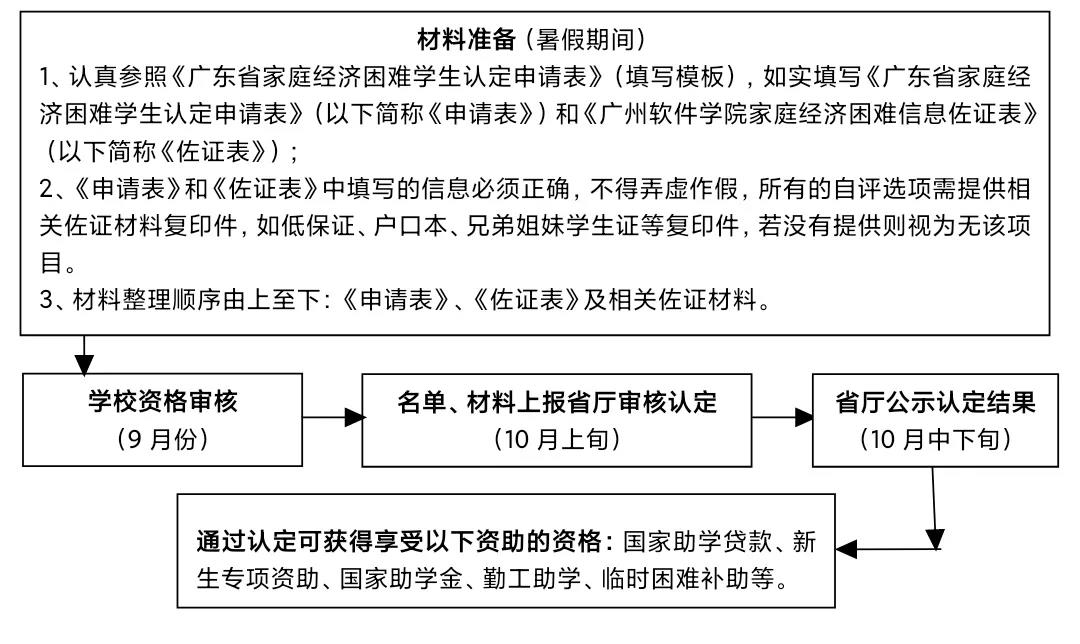 如果你为在校期间的生活费担忧,不用担心,我校已设立了多个资助项目。国家励志奖学金用来奖励优秀的家庭经济困难学生,国家助学金用来补贴生活费,新生专项资助可以缓解经济压力,临时困难补助用来缓解突发性困难,勤工助学帮你一边赚生活费一边提高实践能力。申请以上资助,需在入学后提出广东省家庭经济困难认定申请,只有通过困难认定,才有资格申请资助补贴。认定的材料需在假期提前准备好,详见下表说明——《广东省家庭经济困难认定流程图》 。
