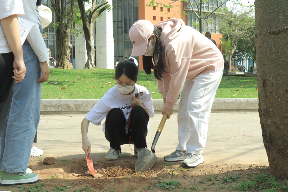 学生为丝木棉培土、浇水