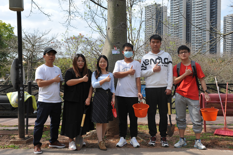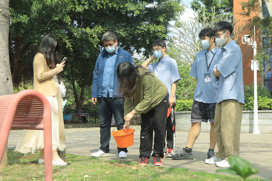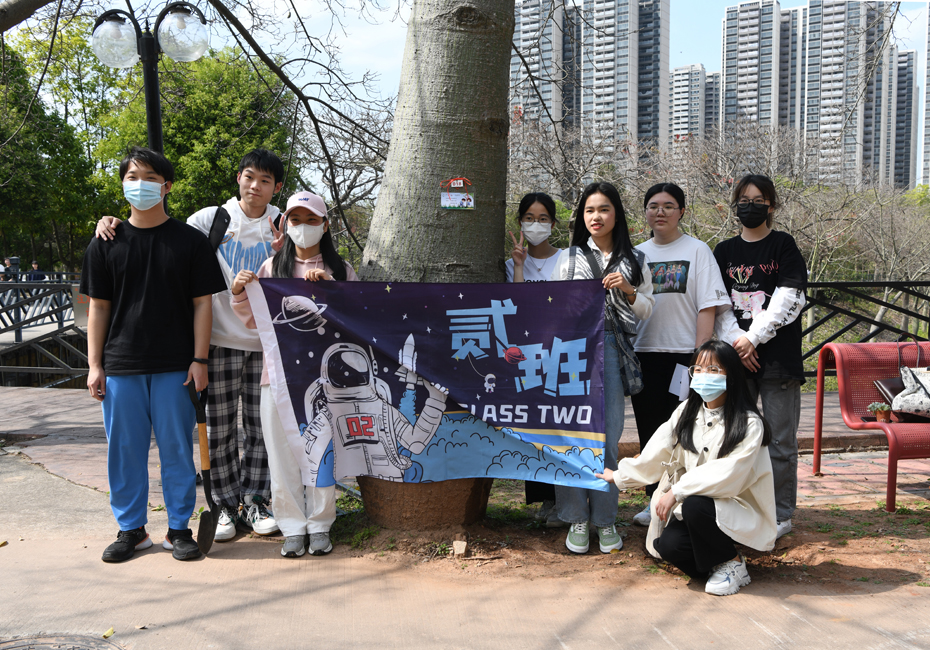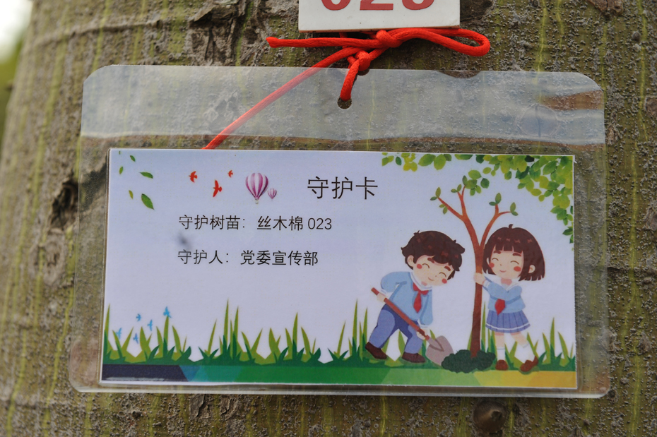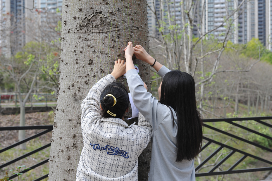 热闹的活动现场,师生凭券领取肥料、工具,给指定的丝木棉施肥、培土、浇水,并系上心愿卡,“培根铸魂”守护校园丝木棉。
