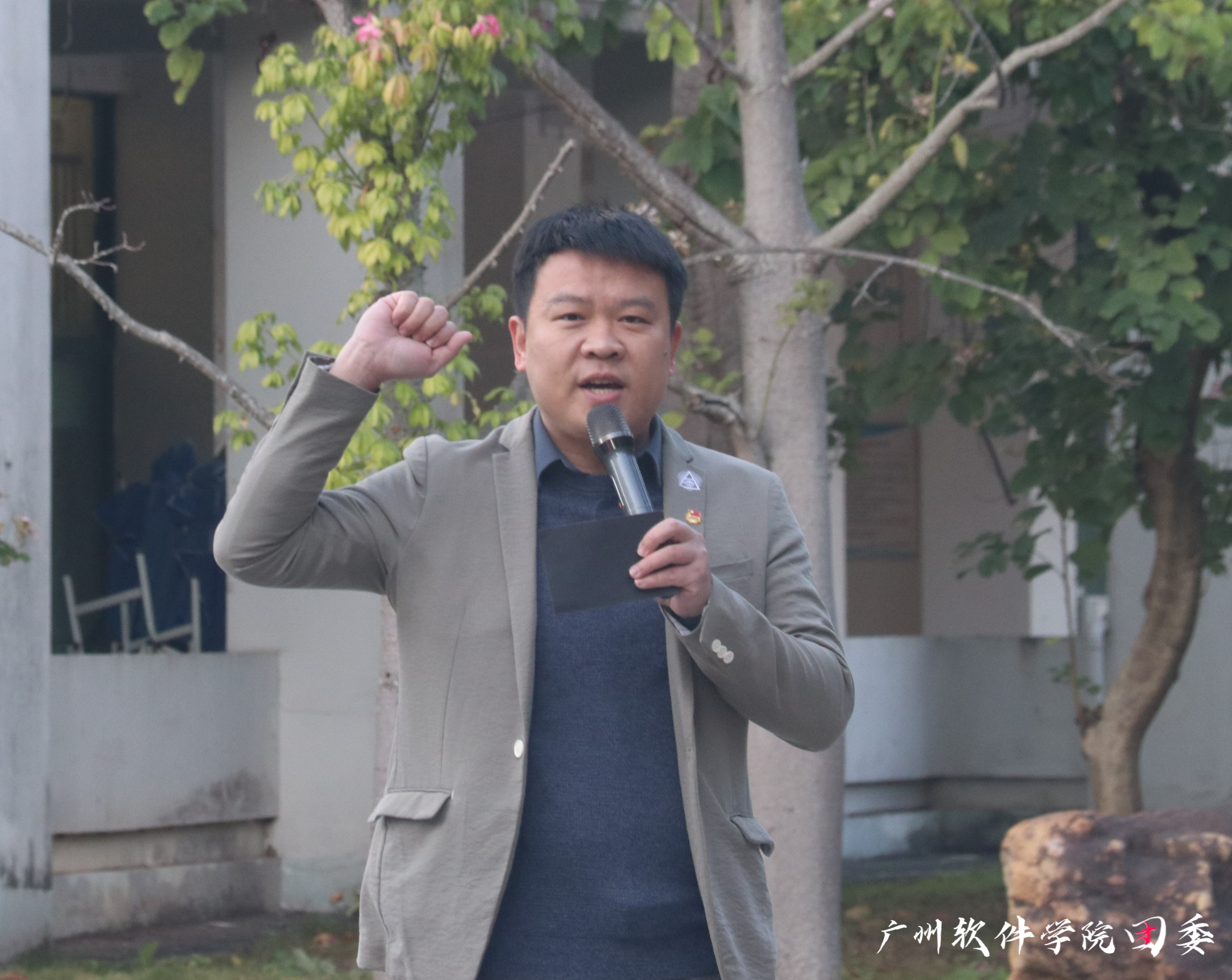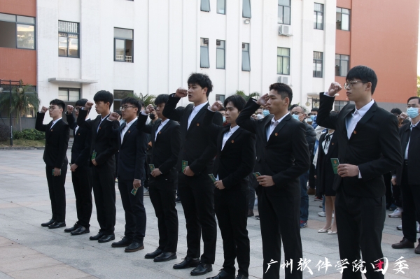 入团仪式在雄壮的国歌中拉开帷幕,校团委朱亮亮副书记宣读《广州软件学院关于2021年发展团员名单宣读报告》并向新团员介绍入团意义。各系党总支书记向新团员佩戴团徽、发放团员证。