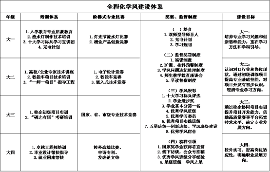 在学风建设上,针对不同年级的培养目标,开展培训、阶梯式专业比赛,制定奖惩监督制度打造全程化学风建设体系,打造优良学风。