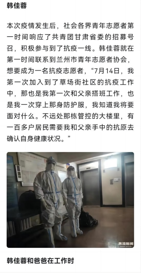 2022年7月19日,文章《鲜衣怒马少年时,不负韶华“疫”中知》成功发布,这篇文章受到了多方关注。兰州电视台在关注到这篇文章后,通过线上采访的方式编辑并发布视频《零零后大学生的“抗疫”日记》、奔流新闻记者在采访后编辑融媒体新闻《【抗疫故事】志愿者队伍中有一对“父女档”》、腾讯新闻“绚丽甘肃”转载文章《青年志愿者韩佳蓉:鲜衣怒马少年时,不负韶华“疫”中知》、兰州市城关区草场街街道办事处也在文章发布后进行了转载宣传。