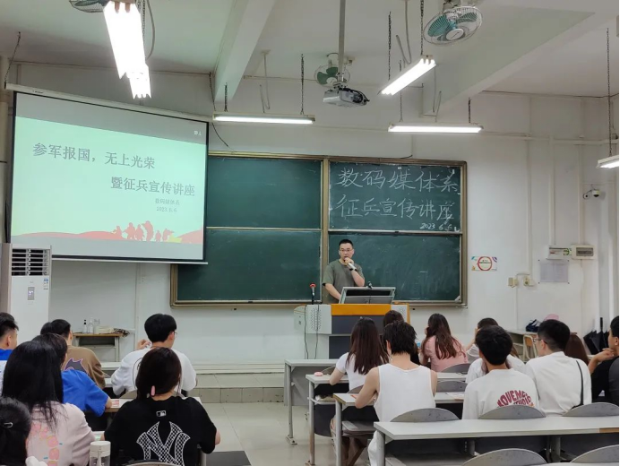 为增强国防意识、厚植爱国情怀,让同学们了解应征入伍的相关政策,营造人人关心国防、积极参与国防建设的氛围,6月6日下午,数码媒体系在教学楼C103召开征兵宣讲会,特邀党委武装部方壮坤老师担任本次活动的主讲,退伍学生马殿刁,谢林峻进行宣讲。宣讲会上,方壮坤老师就征兵政策、报名流程等方面对大学生参军优待政策及发展前景进行了详细的解读,呼吁青年学子积极响应国家号召,携笔从戎,建功立业,将个人的理想抱负融入强军梦、中国梦,为国防事业贡献力量。退伍复学马殿刁同学为大家分享了自己的精彩军旅生活,从入伍经历、入伍感想、参军生涯和成长成才等多个方面分享他的军旅生涯和心路历程。马殿刁讲到,在军营中不仅收获到了难忘的战友情谊,还培养了坚韧的意志精神、坚定的理想信念。征兵宣讲会旨在呼吁同学们坚定理想信念,投身火热军营,绽放属于青年大学生的精彩人生之花。