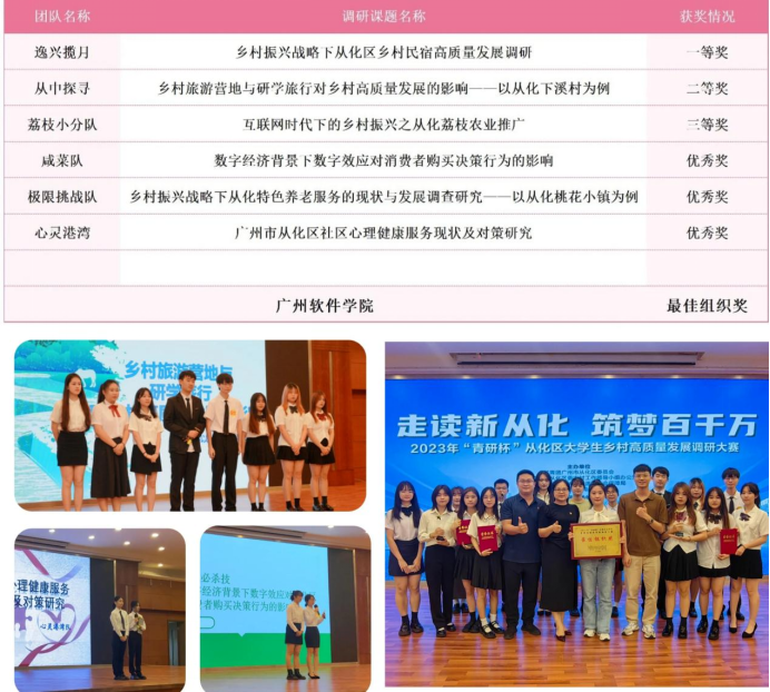 我校六支队伍,分别围绕从化区乡村振兴现状、乡村旅游营地发展情况、数字经济背景下消费者购买决策行为等主题开展调查研究。经过校内初赛、“调查研究”专题培训以及区赛决赛打磨等环节,六支队伍在决赛中均斩获奖项,且我校荣获大赛“最佳组织奖”荣誉称号。