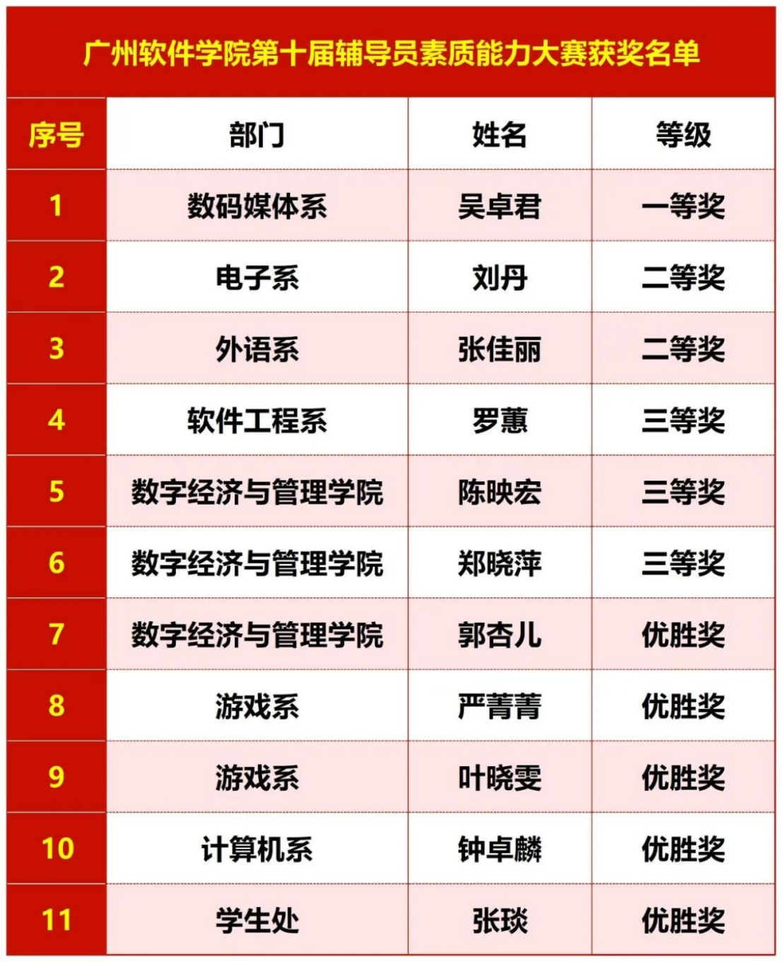 第十届辅导员素质能力大赛决赛,结合基础知识测试笔试成绩,各院(系)部推荐,最终确定外语系张佳丽、电子系刘丹、计算机系钟卓麟等11名辅导员进入决赛参加谈心谈话环节、案例研讨环节。