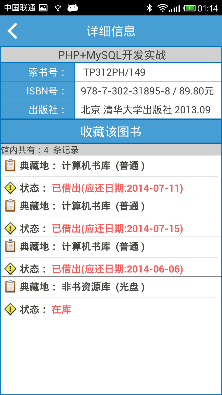 图书搜索:实现了对华软软件学院图书馆藏书的搜索的功能,能准确定位图书所在书库,并能查询所搜索的图书是否已经被借出书库,以及被借出图书的归还时间。如果对某些图书感兴趣,还可以收藏该图书。